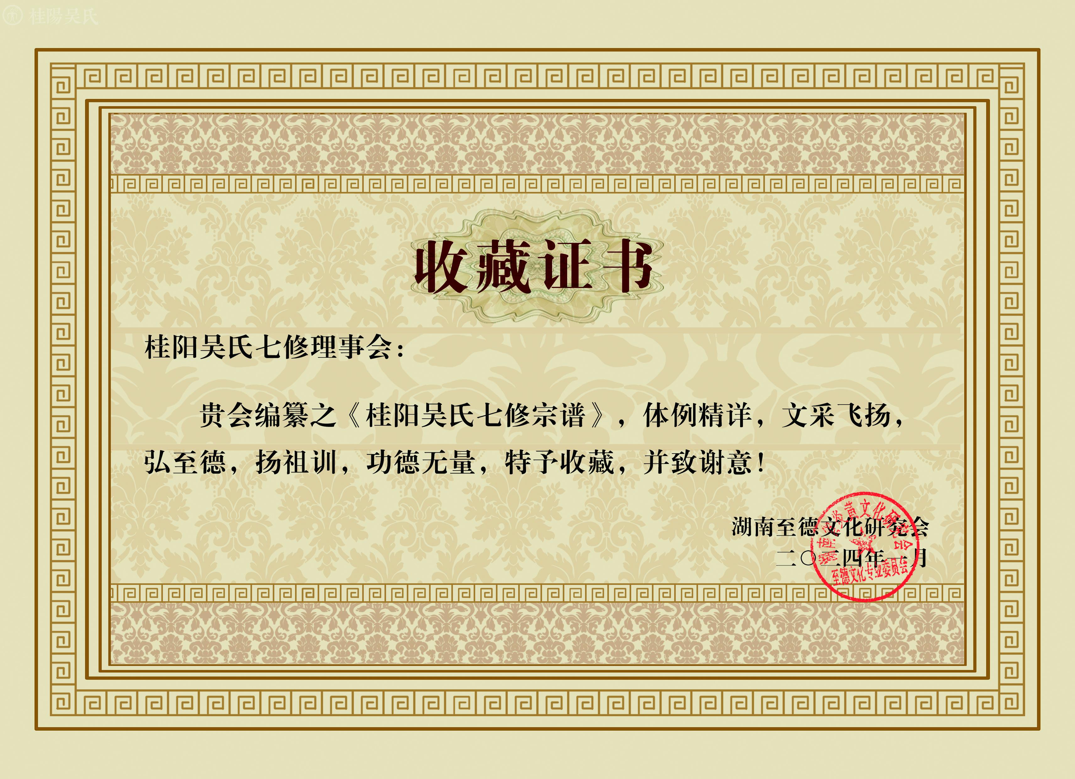 湖南至德文化研究会收藏《桂阳吴氏七修宗谱》并开俱收藏证书
