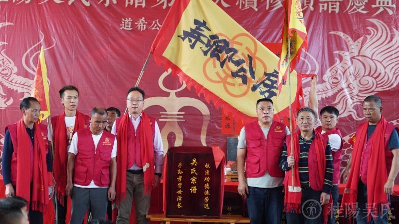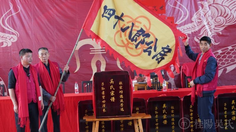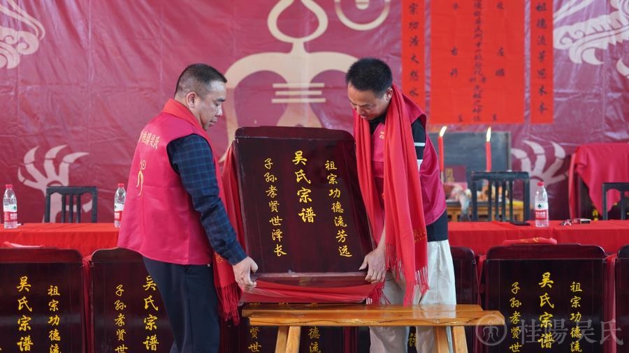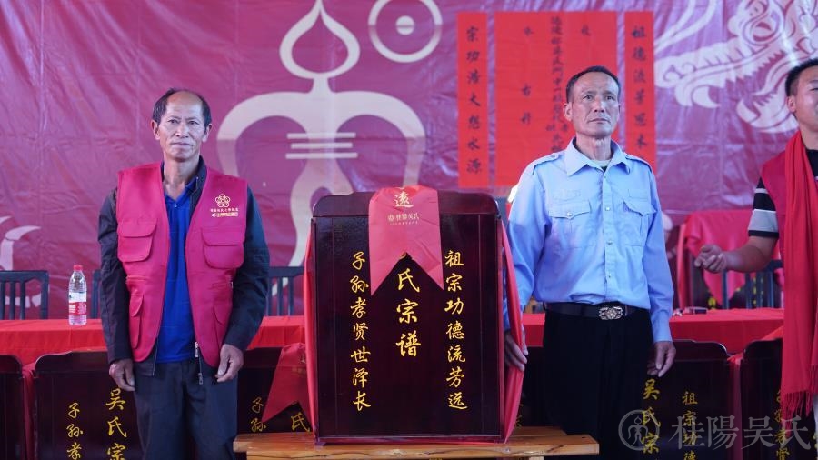 主席台前31个枣红色“吴氏宗谱”箱一字排开,整整齐齐。谱箱上刻着“吴氏宗谱”和对联:“祖宗功德流芳远,子孙孝贤世泽长”。金光闪闪,引人注目。台下摆放着各房房谱,井然有序,整装待发。整座礼堂,人山人海,旌旗密布。