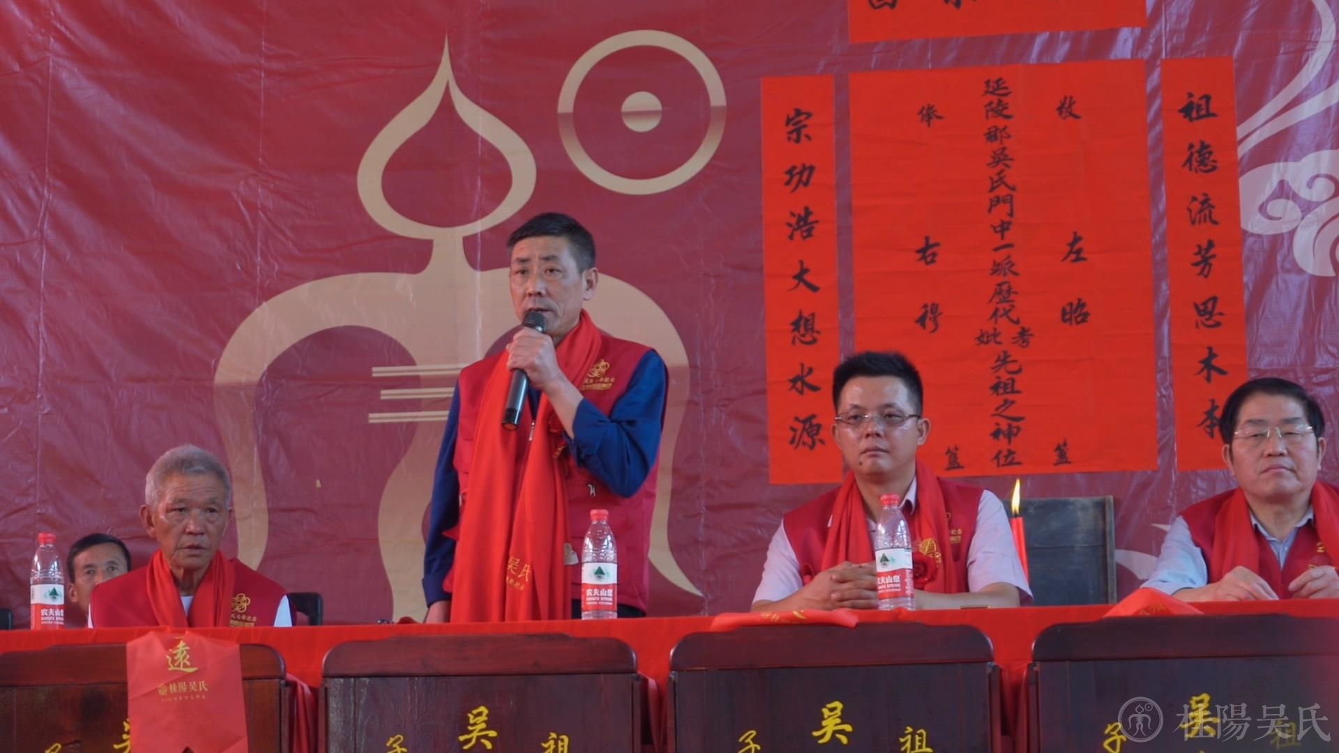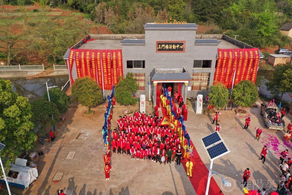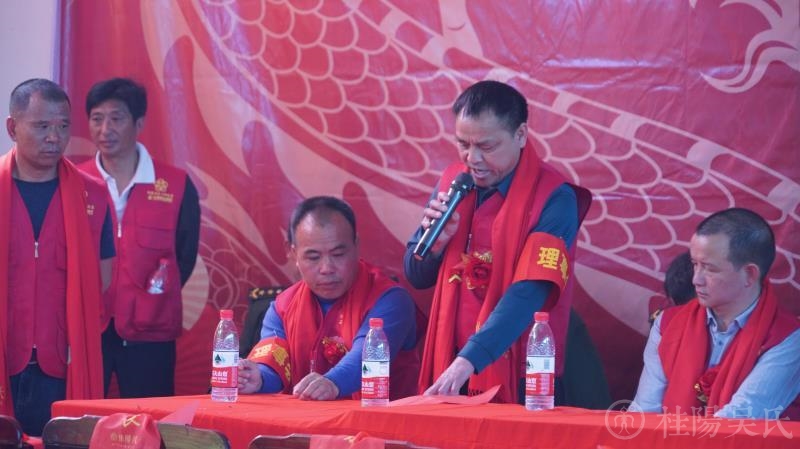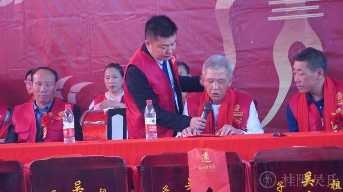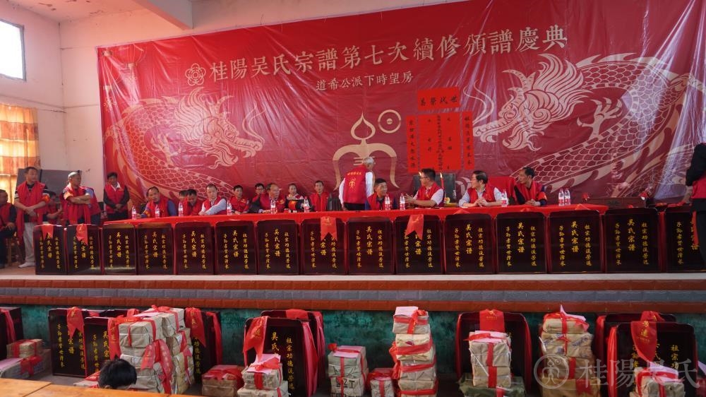进入主会场,上门楼礼堂,这里庄重喜庆,七修颁谱将在这里隆重举行。主席台后一面巨大的红绸布墙,主题是“桂阳吴氏宗谱第七次续修颁谱庆典“”道希公派下时望公房“;左右两边是呼之欲出一飞冲天的两条巨龙;一个古老的“吴”字图腾和祖先神位立在正中央。