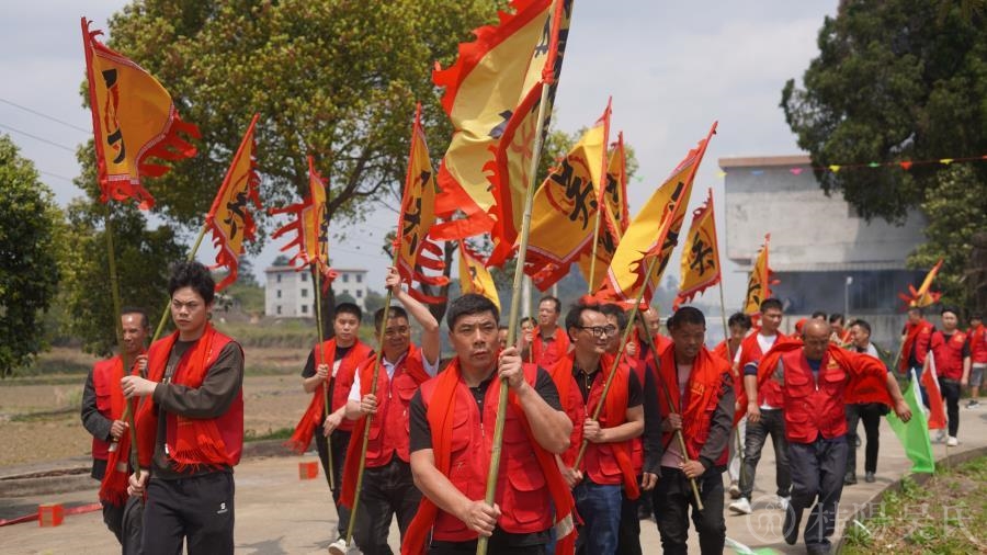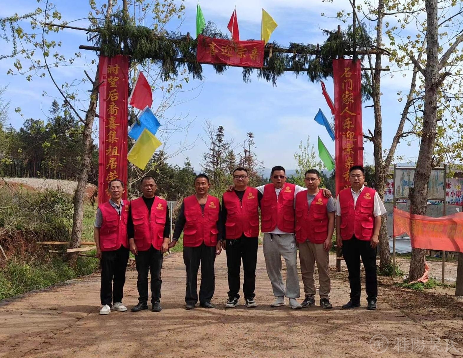 到了石城村委会,吴斌、勇勇、定虎等工作人员热情地为我们发放了旗帜、服装和围巾。旗手们高擎着鲜艳的旗帜,旗帜上的双龙栩栩如生,象征着我们是炎黄子孙龙的传人。宗亲们穿上红色马甲,披着红色围巾,精神抖擞,迈着自豪的步伐,朝着石门山上门楼走去。队伍整齐地穿过用万年青柏树枝扎成的迎宾门,门上“喜迎宗亲”四个大字格外亲切!两边的对联写道:“时望后裔喜集祖居荣颁七修谱,石门家人乐迎宗亲和睦万代昌。”